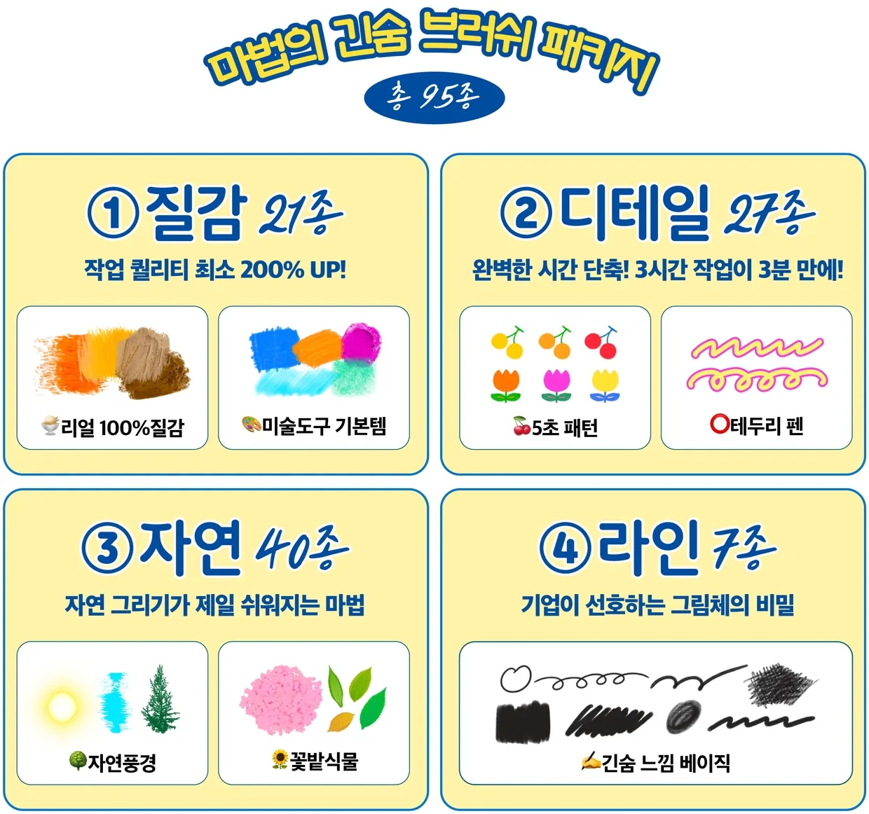 아이디어를 듬뿍 담아 재밌는 브러쉬들을 만들었습니다.