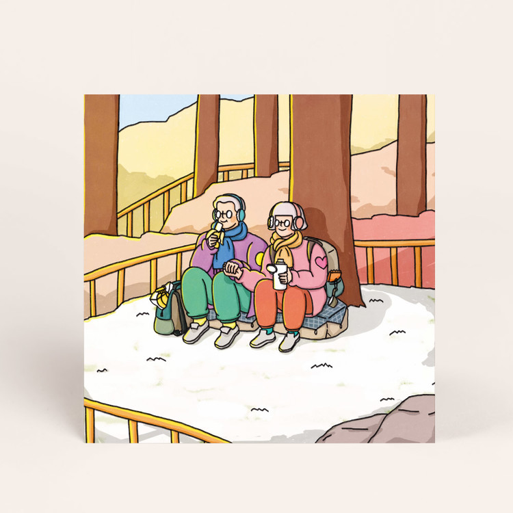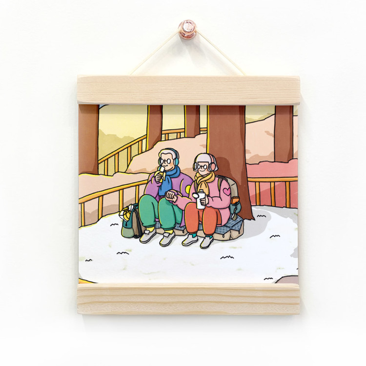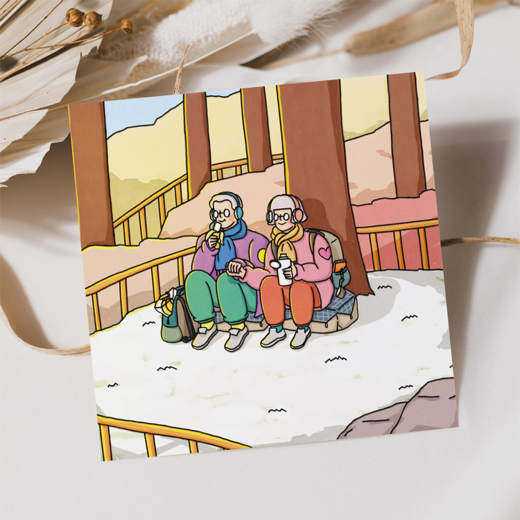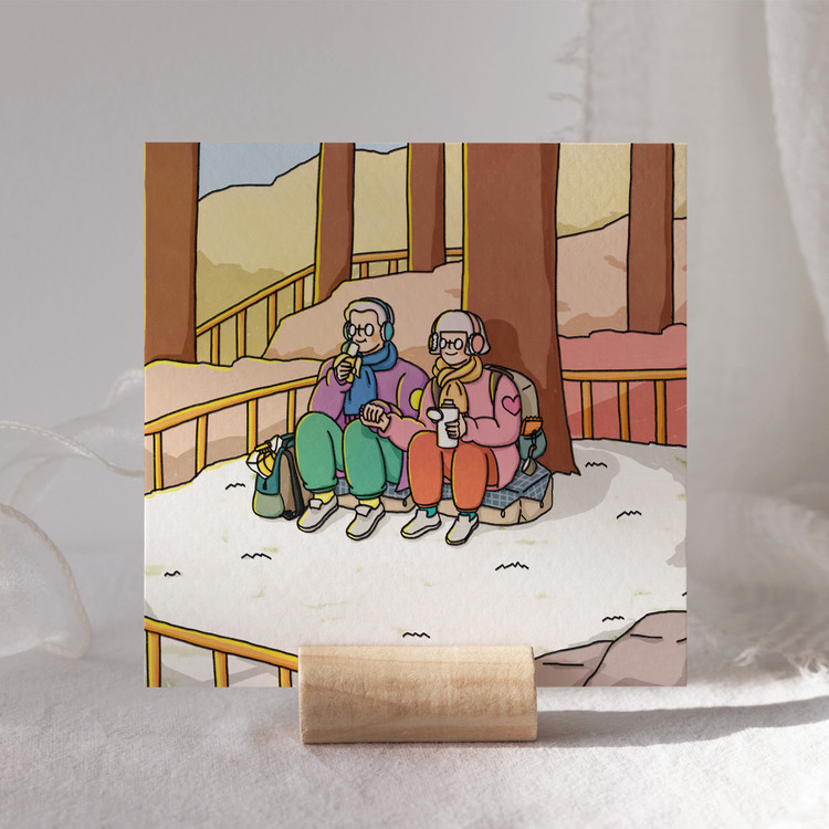 [엽서] 등산, 긴숨 / 135X135mm 정사각형 엽서 우드행잉액자 / 구딩노부부 일러스트